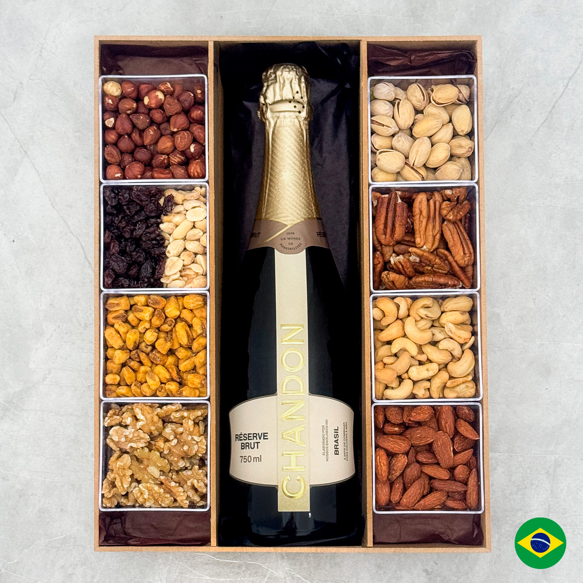 Produtos: - Pistache - Nozes Pecan - Castanha de caju - Amêndoas defumadas - Bombons de chocolate Polonês ao leite recheado com creme de pistache - Tabletes de chocolate Suíço Swiss Alps - Alfajor Havanna - Bombons Lindt Lindor sortidos - Caixa de papel personalizada rígida na cor creme com fechamento magnético Chandon Rèserve - Brut Um vinho espumante clássico vibrante e vivo. Refrescante, frutado e fácil de beber. Aromas elegantes e nítidos, com notas de frutas cítricas, frutas secas, flores brancas e toques de pão fresco. PRODUTOR: Chandon PAÍS: Brasil REGIÃO: Garibaldi TIPO: Espumante TEOR ALCOÓLICO: 13% UVA: Chardonnay (30%), Riesling Itálico (35%) e Pinot Noir (35%) Volume: 750ml