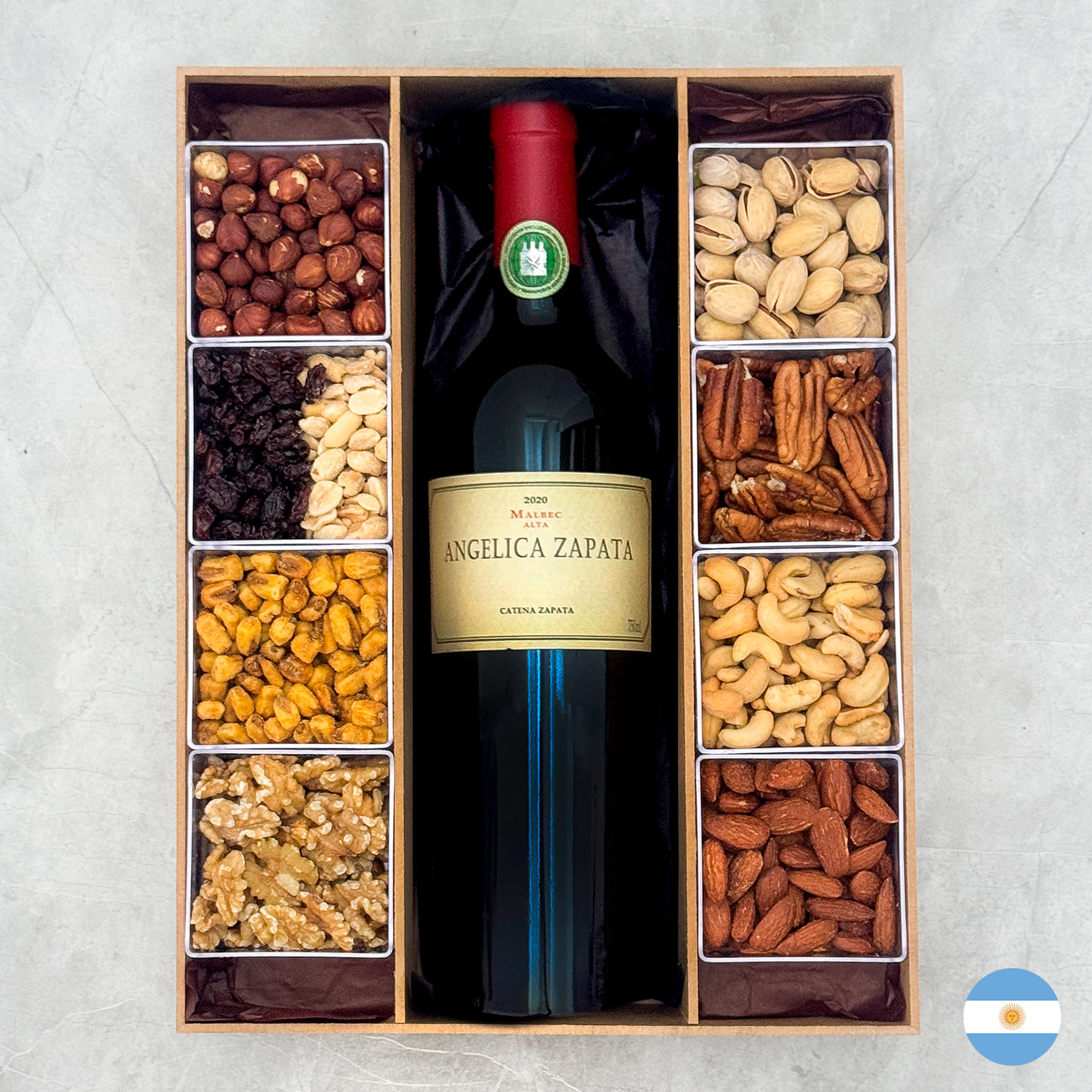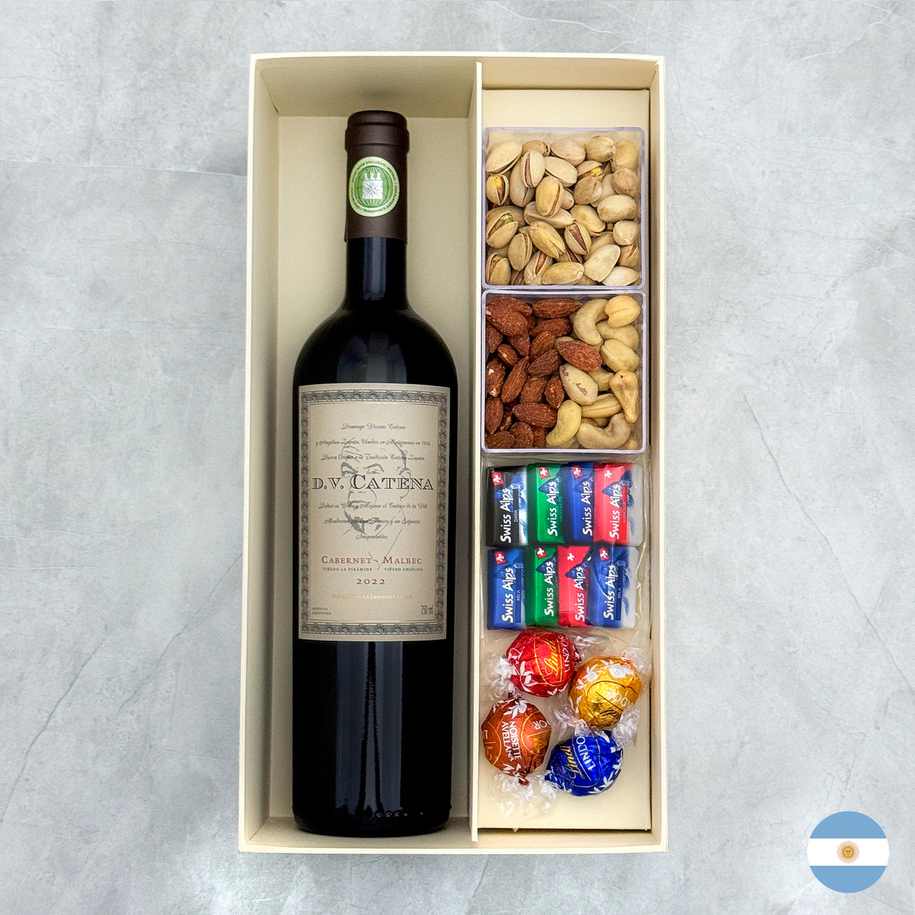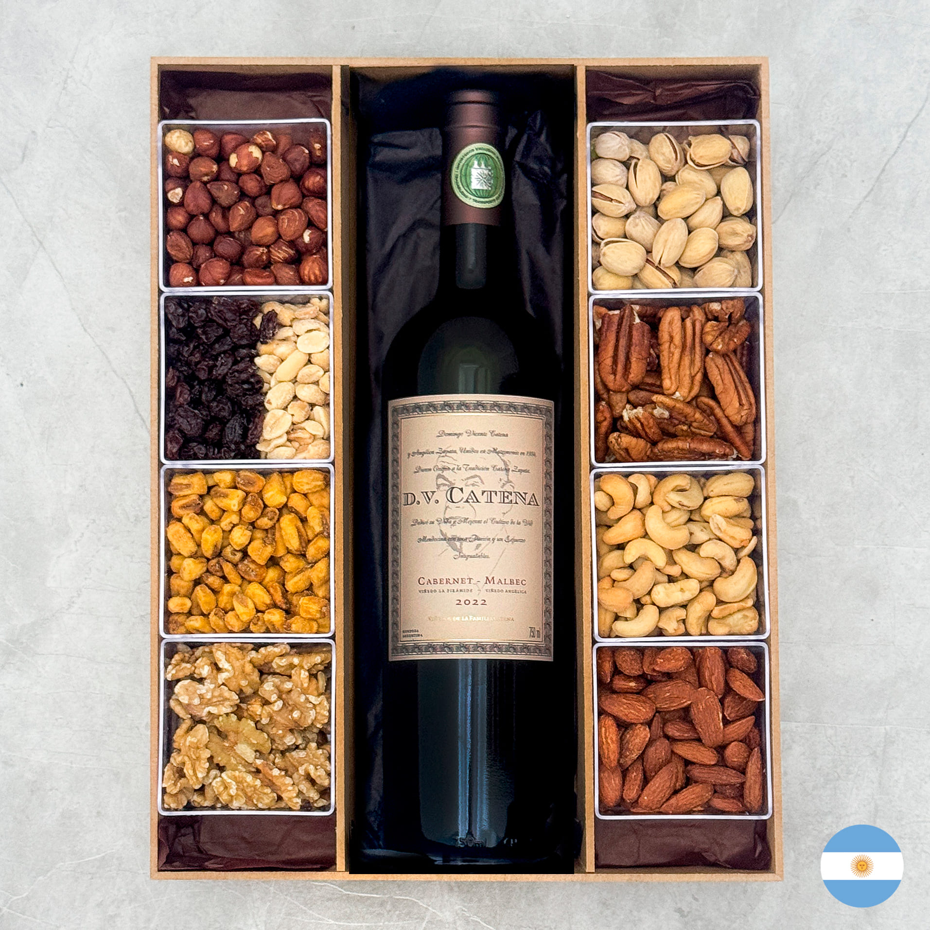 Produtos: - Pistache - Nozes Pecan - Macadâmia - Amêndoas defumadas - Caixa de madeira reutilizável Vinho Tinto DV Catena Cabernet Malbec Classificado com 94 pontos por James Suckling na safra 2018, o excelente DV Catena Cabernet Malbec é elaborado com uvas de dois terroirs distintos, de altitudes diferentes. Este emblemático corte argentino, combina a exuberância de fruta da Malbec com a estrutura e elegância da Cabernet Sauvignon, resultando em um vinho de ótima complexidade, com um toque sedoso e macio no palato. Maturado 12 meses em barricas de carvalho, 90% francesas e 10% americanas Produtor: Catena Zapata País: ArgentinaRegião: Mendonza Uvas: Malbec (50%) e Cabernet Sauvignon (50%) Teor alcóolico: 13,5% Tipo: Tinto Volume: 750 ml