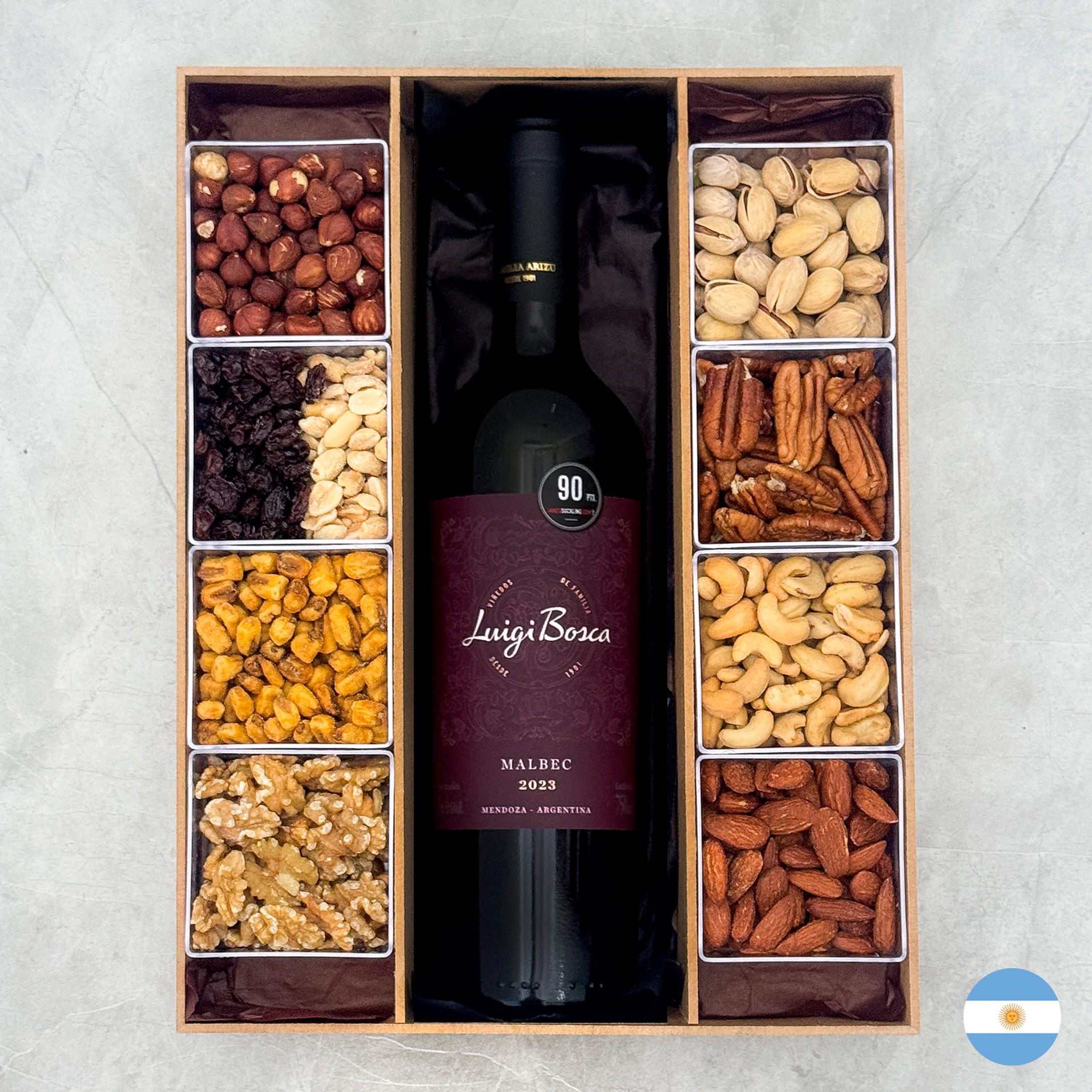 Produtos: - Pistache - Nozes Pecan - Castanha de Caju - Amêndoas defumadas - Caixa de madeira reutilizável Vinho tinto seco Luigi Bosca Malbec Rubi com alo violáceo. Os aromas remetem a ameixas, amoras e morangos maduros, tons florais e de especiarias. Bom corpo, amplo, fluído, com taninos presentes, porém amáveis. Notas de carvalho adicionam camadas extras de sabor. Vinho de grande tipicidade, fiel ao terroir mendocino. PRODUTOR: Bodega Luigi Bosca PAÍS: Argentina REGIÃO: Lujan de Cuyo, Valle de Uco, Mendoza TIPO: Vinho tinto seco TEOR ALCOÓLICO: 14,4% UVA: Malbec AMADURECIMENTO: 12 meses em barricas de carvalho VOLUME: 750ml